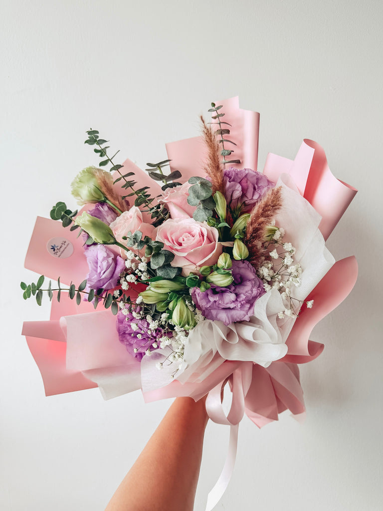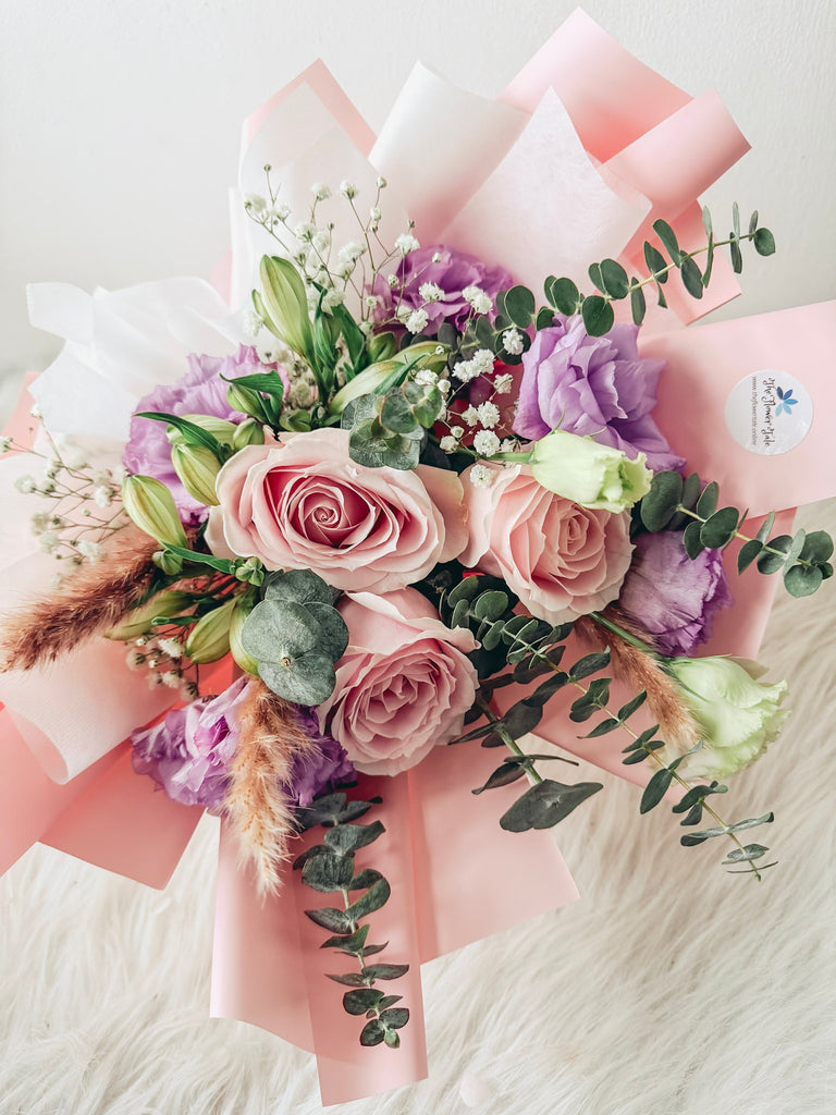 Comes with 3 stalks of roses, eustomas, eucalyptus and fillers.