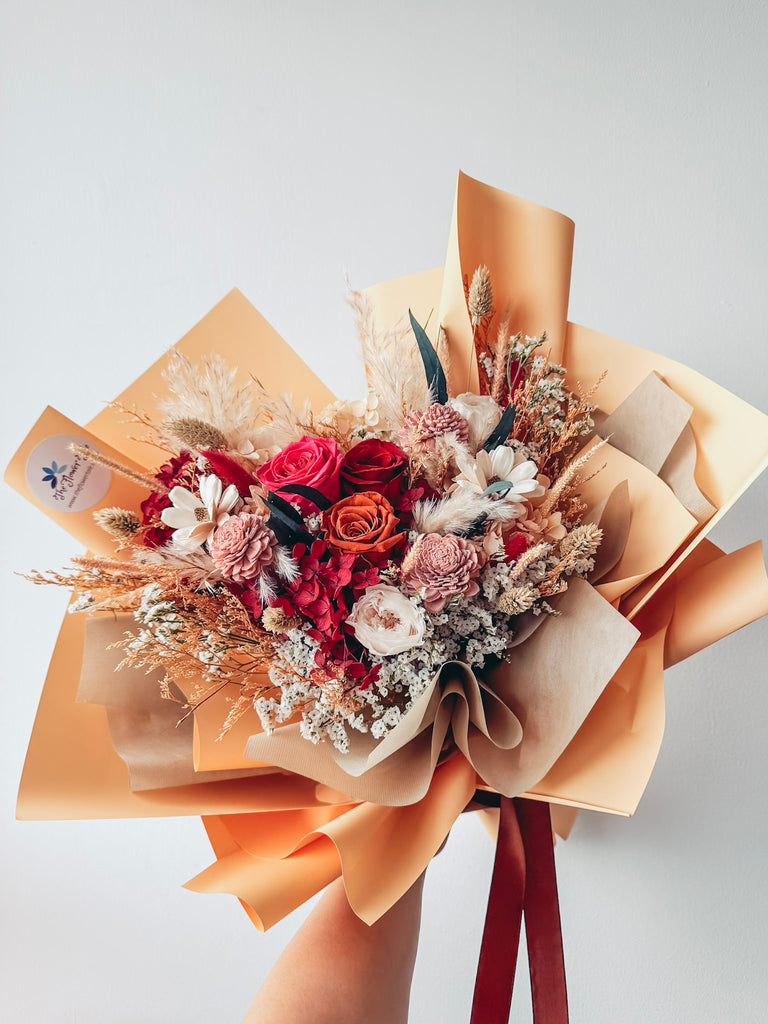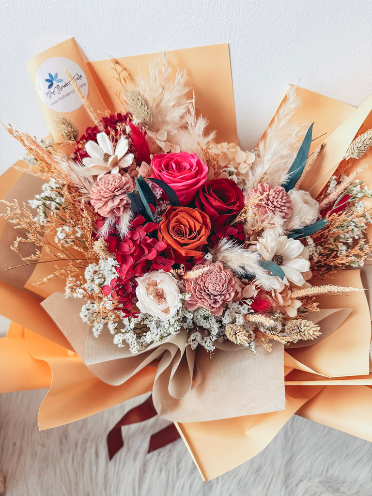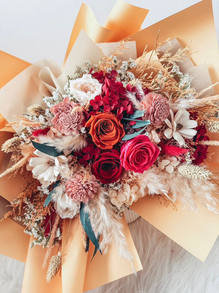 Comes with 3 stalks of preserved roses, preserved hydrangeas and some dried and preserved fillers.