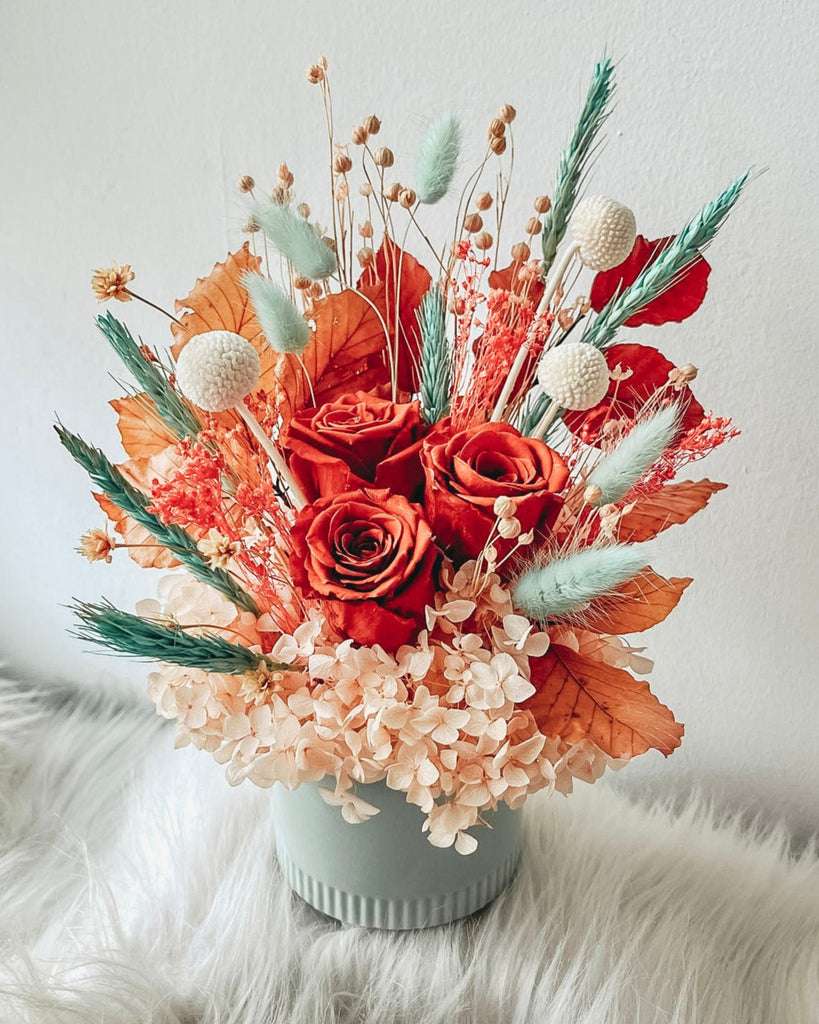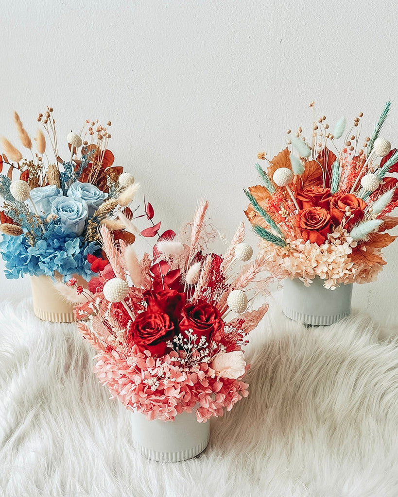 A petite vase of preserved flowers, designed to last months with minimal care.