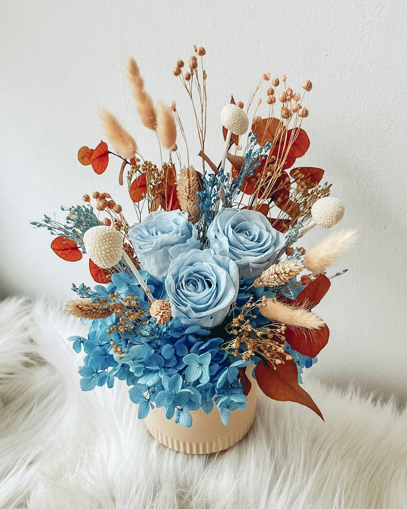 A petite vase of preserved flowers, designed to last months with minimal care.