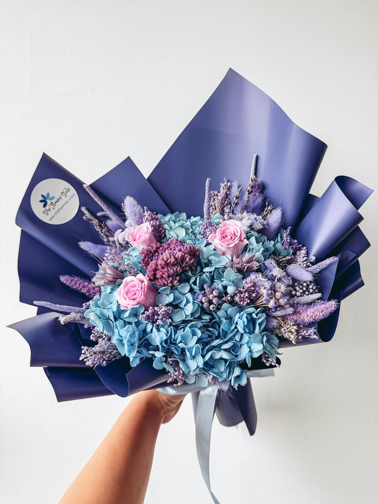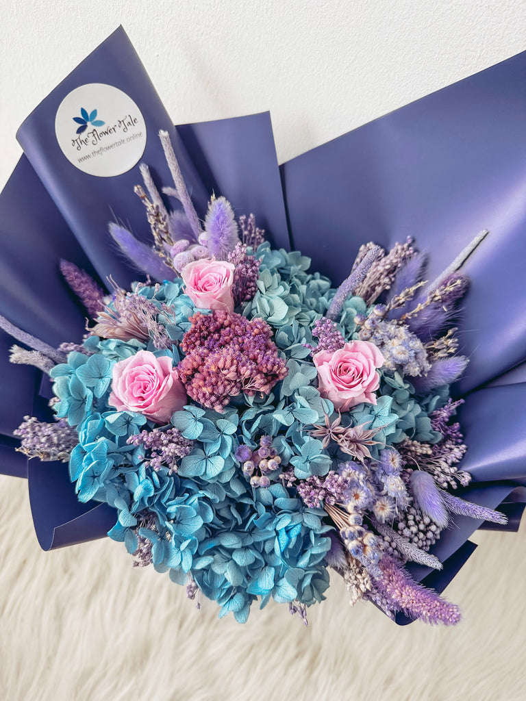 Comes with preserved hydrangeas and some dried and preserved fillers.